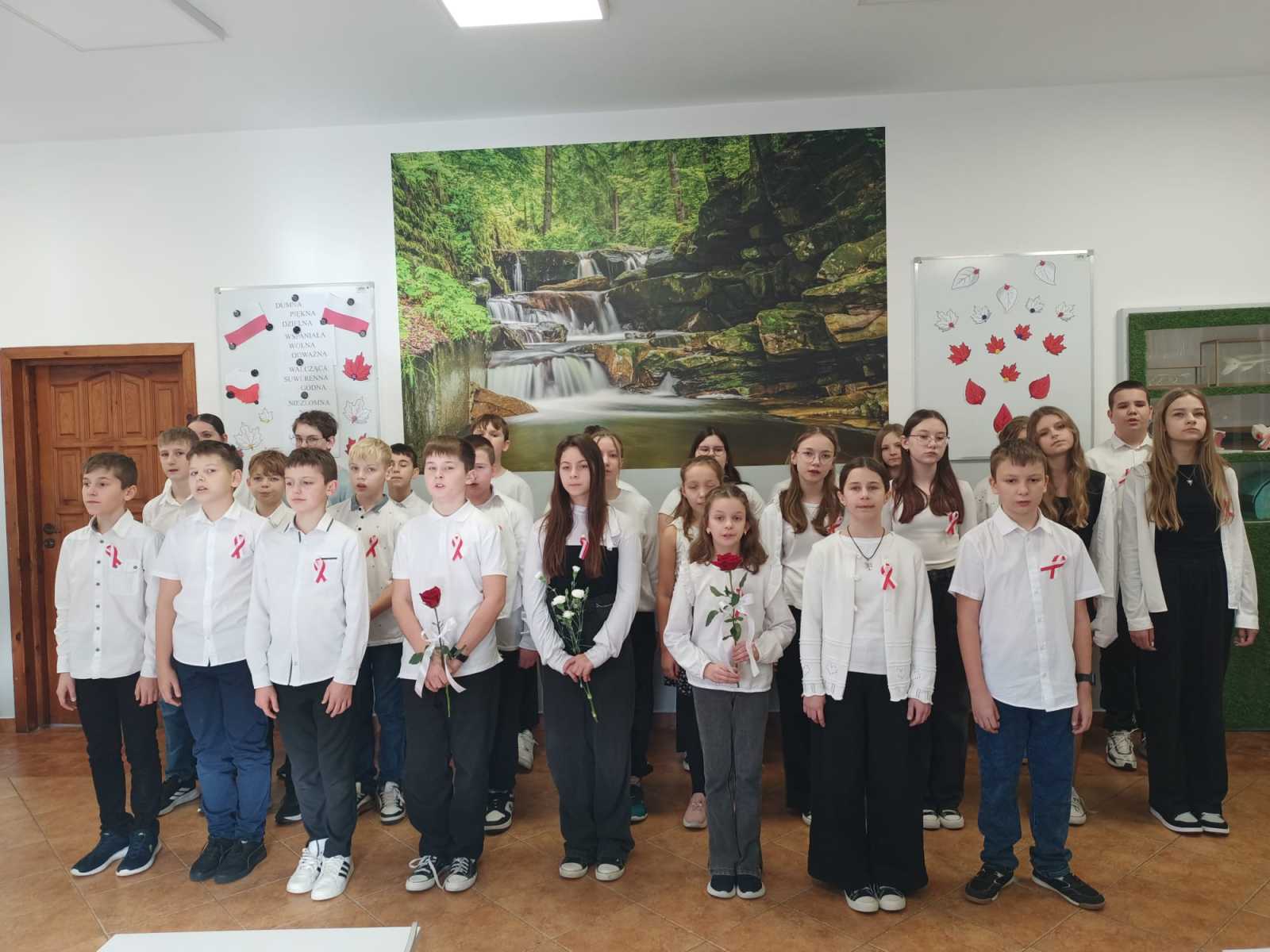 Cała społeczność szkolna uroczyście odśpiewała „Mazurka Dąbrowskiego”, łącząc się symbolicznie z uczniami w całej Polsce.